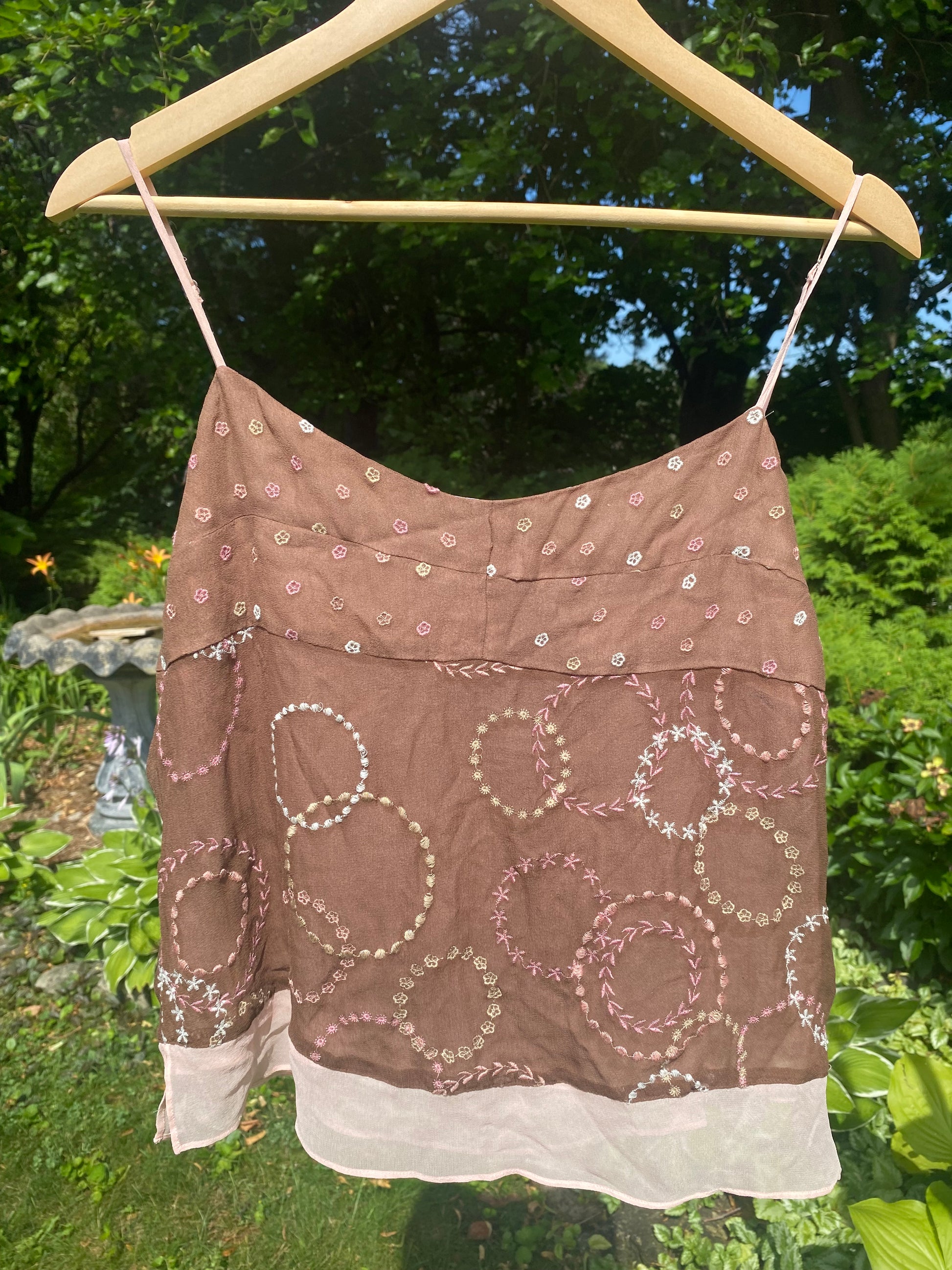 Soft and distinctive, this vintage brown cami features intricate circular stitching that adds subtle texture and visual interest. The delicate spaghetti straps and relaxed drape create an effortlessly feminine silhouette. Lightweight and comfortable, it’s perfect for layering or wearing on its own during warmer days.
