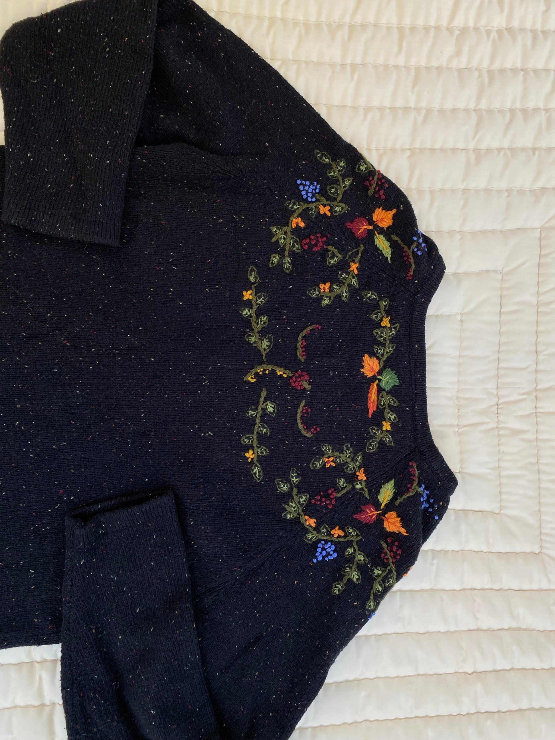 Meet the perfect fall piece š ā this vintage-inspired floral embroidered cardigan is cozy, versatile, and made for layering. The dark navy speckled knit brings instant autumn vibes, while the colorful floral embroidery across the chest and shoulders adds a whimsical cottagecore touch.